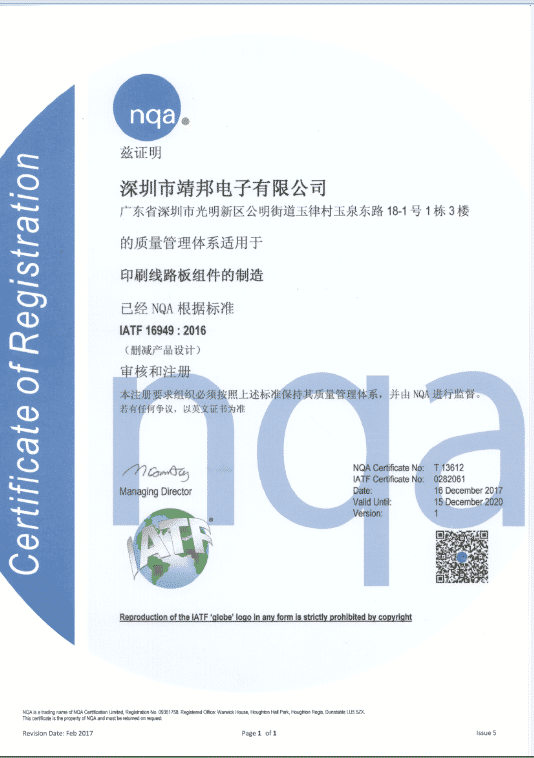 做汽车SMT贴片加工的制造商首先应该遵守ISO9001的管理规定,只有完全符合了ISO9001的管理体系,才能申请IATF16949管理证书,靖邦完全符合ISO9001质量管理体系,并致力于遵守汽车pcb制造和组装最严格的标准。